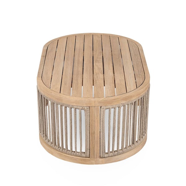 Remy Village Patio Solid Wood and Rope Woven Oval Outdoor Coffee Table, Light Teak Finish