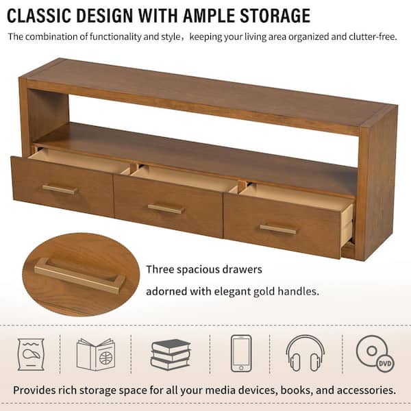 Rumi Modern Brown MDF TV Stand Fits TV's up to 79 in. Entertainment Center with 3-Drawers, Metal Handles, Open Storage
