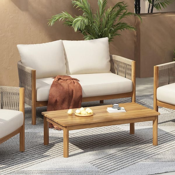 Rumi Outdoor Rope Weave and Solid Wood Patio Loveseat and Coffee Table Set with Beige Cushions, Teak