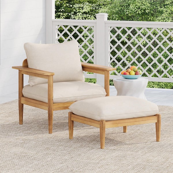 Terassi Patio Solid Wood Outdoor Lounge Chair with Ottoman and Beige Cushions, Light Teak