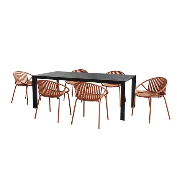 Verona Modern Patio 7-Piece Plastic and Metal Outdoor Dining Set with Stackable Chair, Black + Orange, 6 Seater