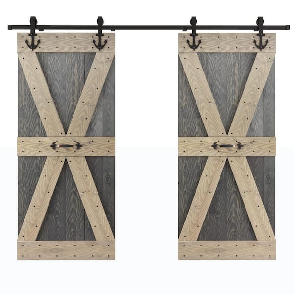 72 in. x 84 in. X-Series Embossing Dark Gray/Light Gray DIY Knotty Wood Double Sliding Door With Hardware Kit