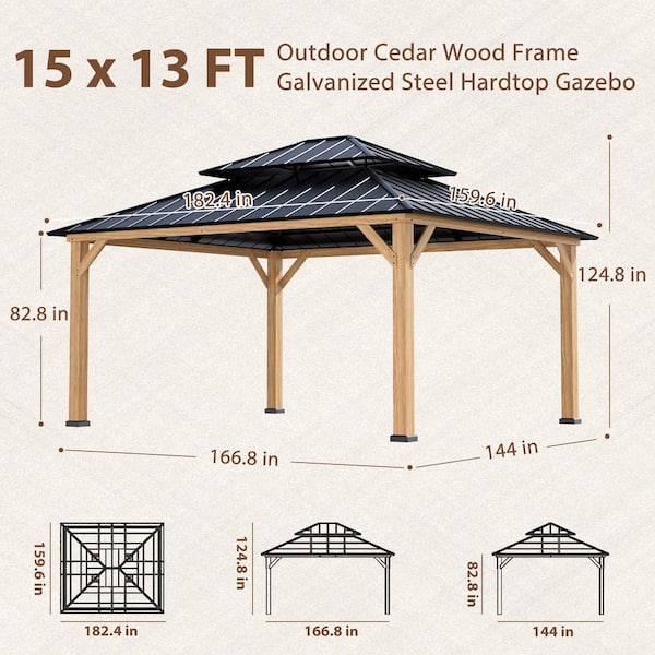 13 ft. x 15 ft. Outdoor Patio Steel Hardtop Gazebo, Solid Cedar Framed Wood Gazebo with Double Roof
