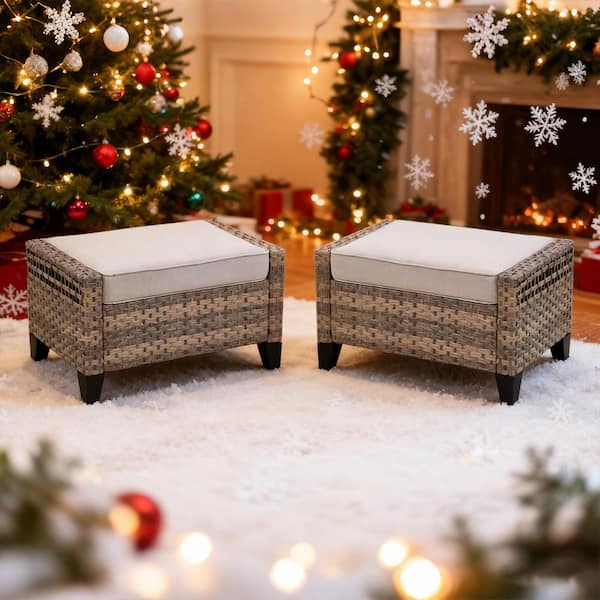 2-Piece Brown Wicker Outdoor Ottoman Patio Rattan Footstool with Removable Gray Cushions