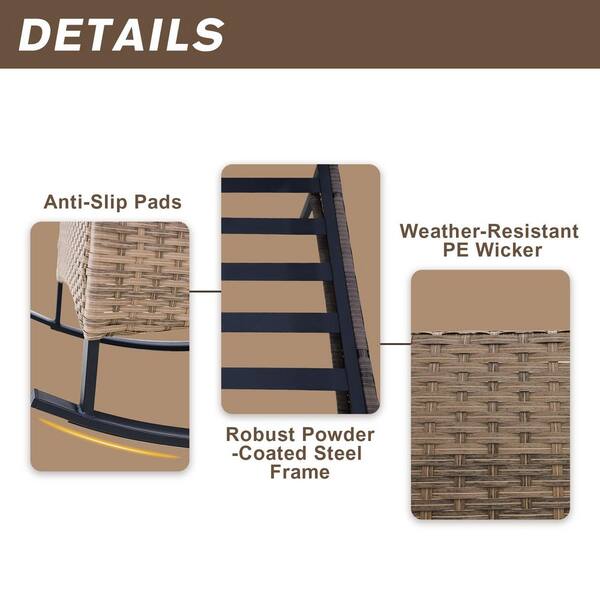 3-Piece Brown Wicker Outdoor Rocking Chair Set with Beige Cushion and Double-Layer Storage Coffee Table