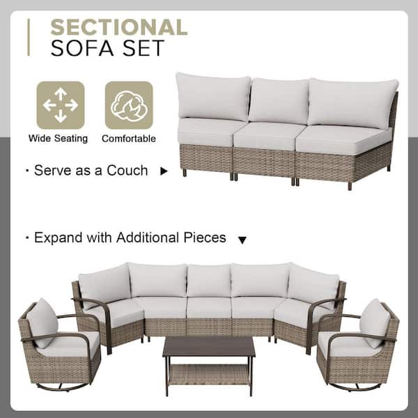 3-Seat Armless Brown Wicker Patio Outdoor Curved Sectional Sofa Set with Beige Cushions