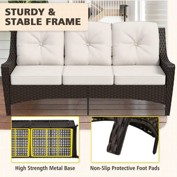 3-Seat Brown Wicker Outdoor Couch Patio Sofa with Deep Seating and Beige Cushions