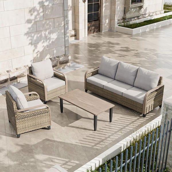 4-Piece Brown Wicker Outdoor Patio Conversation Set 3-Seat Sofa, Lounge Chairs with Gray Cushions and Coffee Table