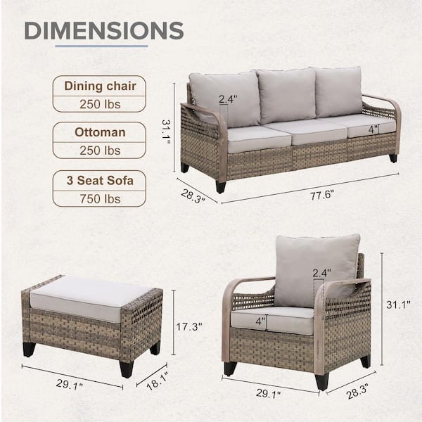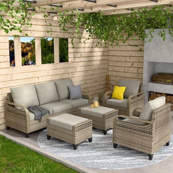 5-Piece Brown Wicker Outdoor Furniture Set Patio Conversation Seating Set with Gray Cushions and 2 Ottomans
