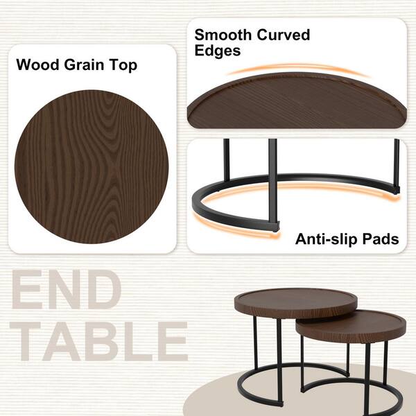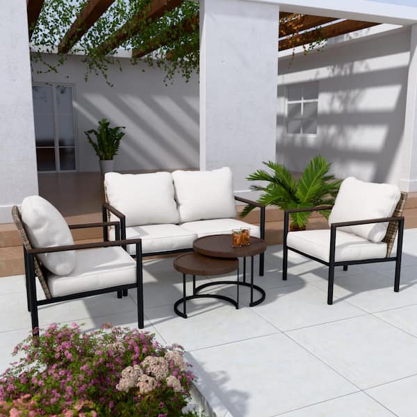 5-Piece Light Brown Rattan Wicker Outdoor Patio Conversation Set with Wood Grain Top Coffee Tables and Beige Cushions
