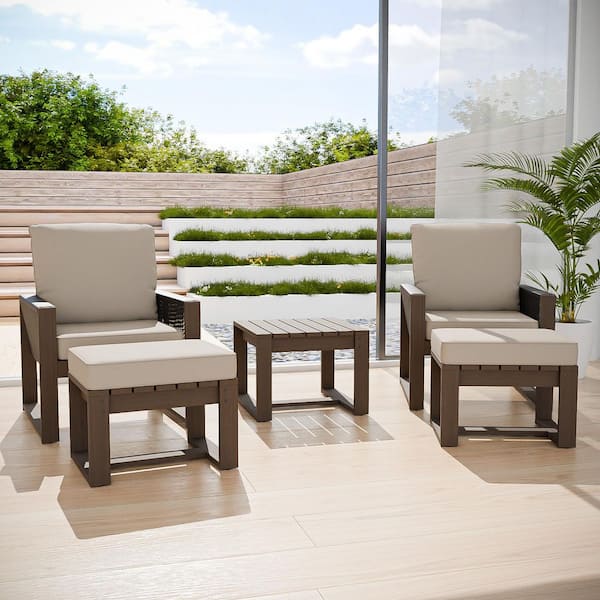 5-Piece Wood Outdoor Patio Conversation Set with Lounge Chairs, Outdoor Sofa Seating Set with Beige Cushions