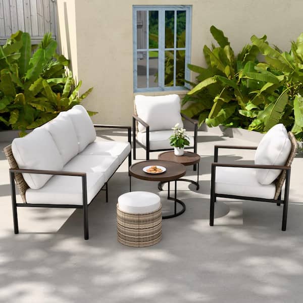 6-Piece Light Brown Wicker Outdoor Patio Conversation Set with Wood Grain Top Coffee Tables, Ottoman, Beige Cushions