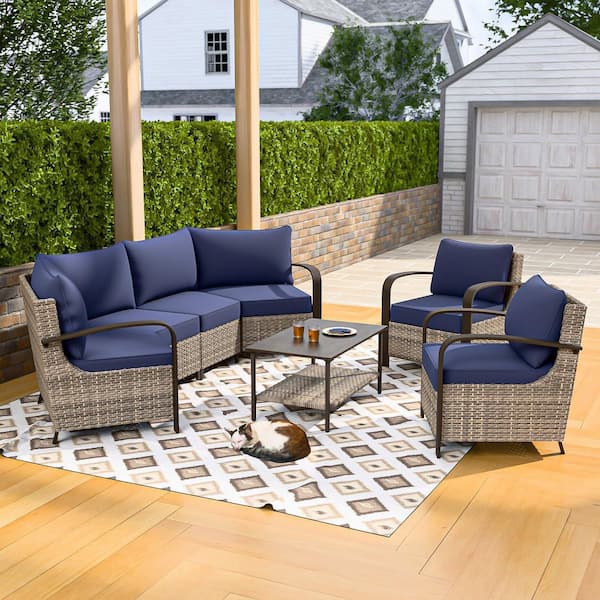 7-Piece Wicker Patio Conversation Sectional Seating Set with Blue Cushions