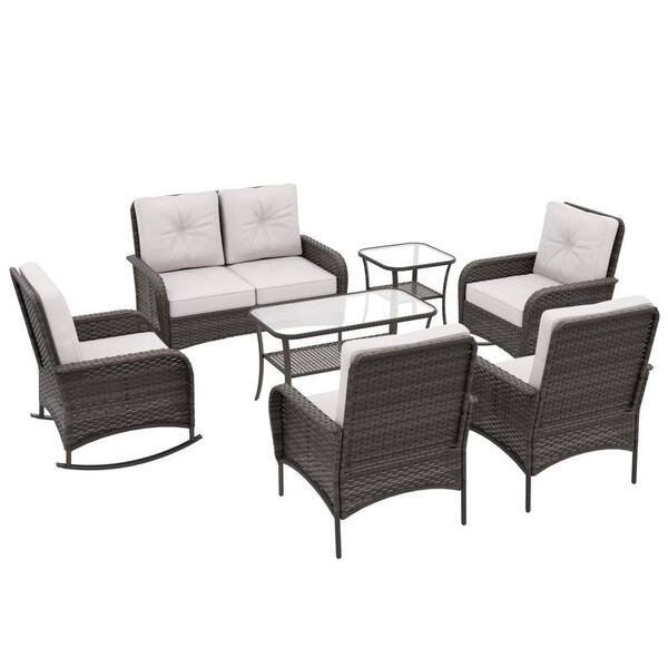 7-Piece Wicker Patio Conversation Set with Beige Cushions -Loveseat, Chairs, Rocking Chairs, Side Table and Coffee Table