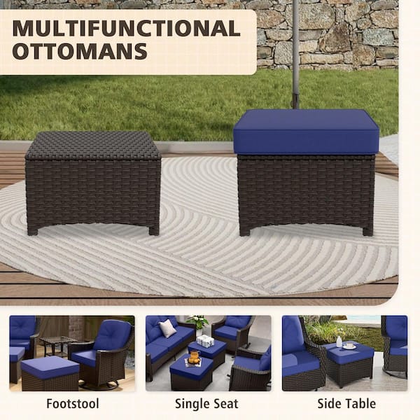 Brown 8-Piece Wicker Patio Conversation Set with Swivel Rocking Chairs, Outdoor Sofa Seating Set with Blue Cushions