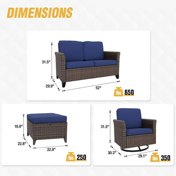 Brown Rattan Wicker 5-piece Outdoor Patio Conversation Set with Blue Cushions, Ottomans