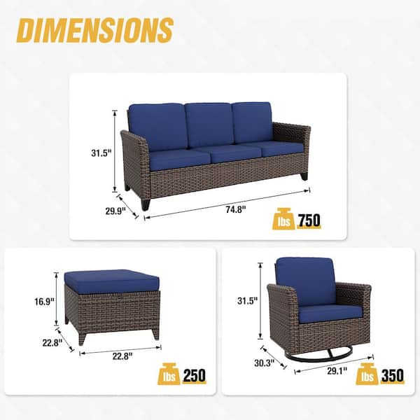 Brown Rattan Wicker 5-piece Outdoor Patio Conversation Set with Blue Cushions, Ottomans