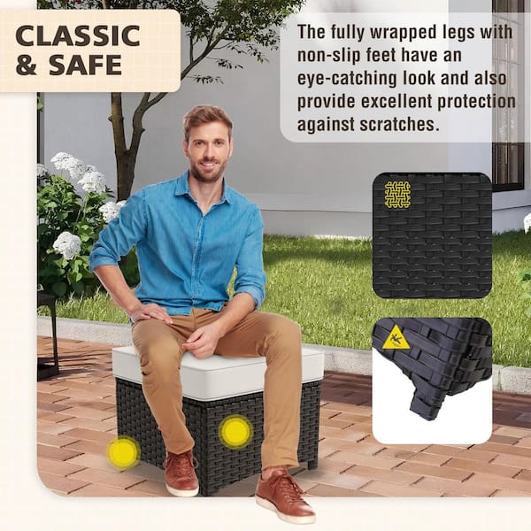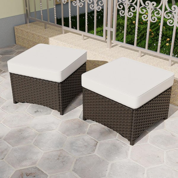 Brown Wicker Outdoor Ottoman Patio Footstool with Beige Cushions (2-Pack)