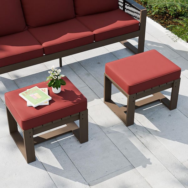 Nature Cedar Wood Outdoor Ottoman Patio Footstool with Red Cushions (2-Pack)
