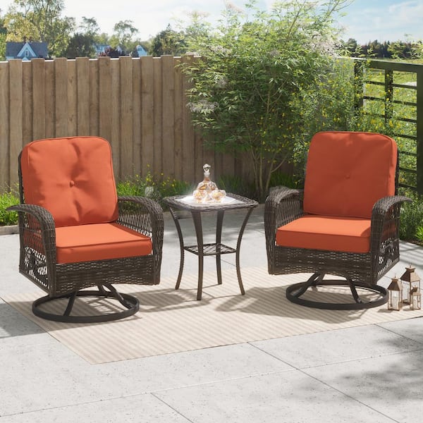 Livorno Brown 3-piece Steel Wicker Patio Swivel Chair Set with Orange Cushions