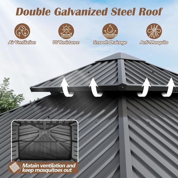 8.5 ft. x 8.5 ft. Outdoor Hardtop Gazebo with Wood Posts, Galvanized Steel Doule Roof and Netting and Curtains for Patio