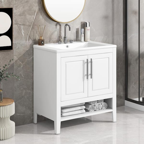 30.00 in. W x 18.30 in. D x 32.50 in. H Freestanding Bath Vanity in White with Ceramic Sink Top, 2-Doors and 2-Drawers