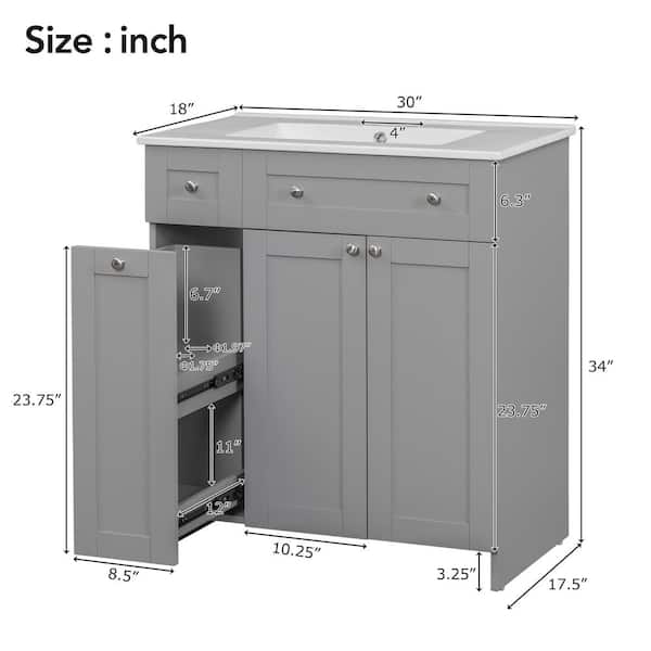 30 in. W x 18 in. D x 34 in. H Freestanding Bath Vanity in Gray with White Ceramic Top, 2-Doors, Double-Tier Drawer