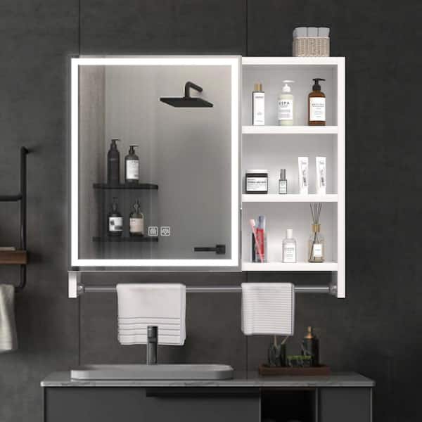 31.5 in. W x 27.56 in. H Rectangular White Metal Medicine Cabinet with Mirror, LED Lights, Towel Rails