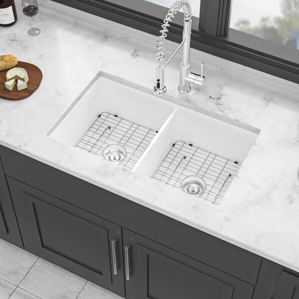 32 in. Undermount Double Bowl Dual Mount White Ceramic Rectangular Deep Kitchen Sink Basin