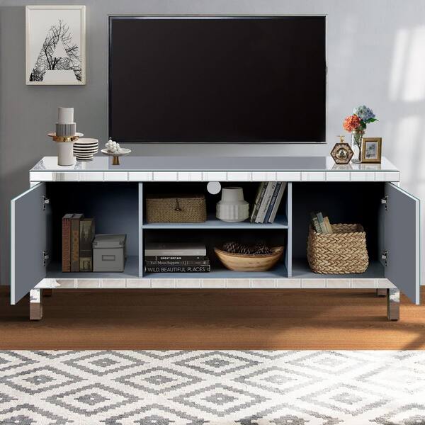 59 in. W x 15.7 in. D x 25 in. H Silver Linen Cabinet with Open Storage, M Shape Sparkling Mirror Doors