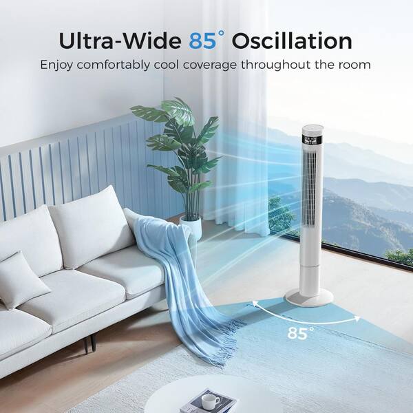 43.31 in. 3-Speed 11.81 in W Tower Fan in White 85° Oscillating Fan with Digital Display Timer and Remote Control