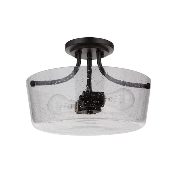 Tyler 13 in. 2-Light Flat Black Finish Transitional Semi Flush Mount Ceiling Light with Clear Seeded Glass