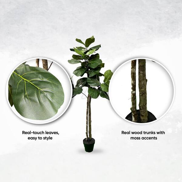 Handmade 5 ft. Artificial Fiddle Leaf Fig Tree in Home Basics Plastic Pot Made with Real Wood and Moss Accents
