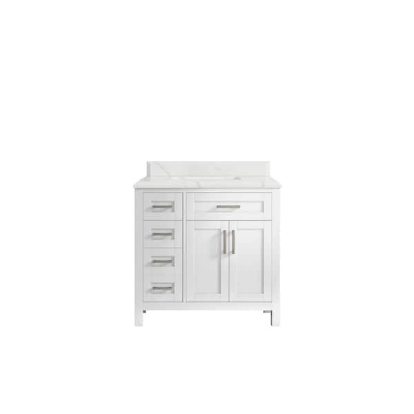 Cambridge 36 in. W x 22 in. D x 36 in. H Center Sink Bath Vanityin White with Cove Edge Calacatta Quartz Top
