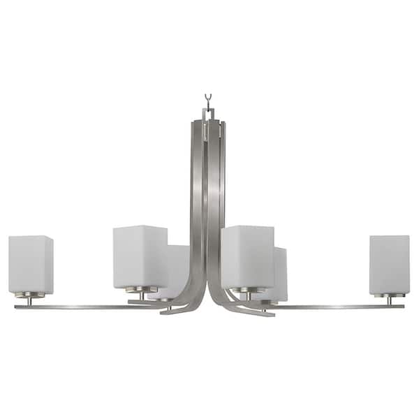 6-Light Satin Steel Chandelier Etched Dove White Glass Shade