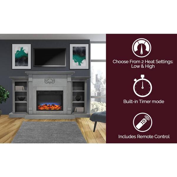 Sanoma 72 in. Electric Fireplace in Gray with Built-in Bookshelves and a Multi-Color LED Flame Display