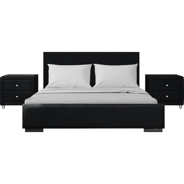 Hindes Black Wood Frame Queen Size Platform Bed Upholstered with 2 Nightstands