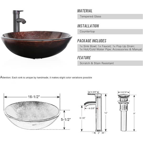 Cameo Solid Tempered Glass Round Vessel Sink in Brown with Faucet Pop Up Drain Set