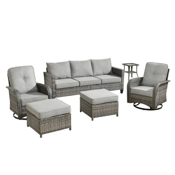 Audrey Gray 6-Piece Wicker Outdoor Patio Conversation Set With Rocking Swivel Chairs and Dark Gray Cushions.