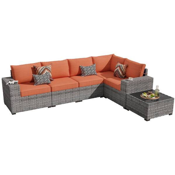 Baskra Gray 6-Piece Wicker Outdoor Loveseat Sectional Set with Orange Red Cushions and Coffee Table for Poolside