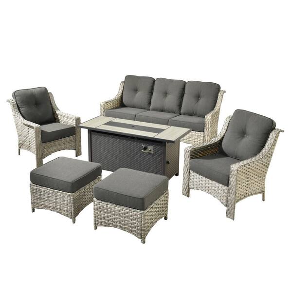 Cavara Gray 5-Piece Wicker Outdoor Patio Conversation Set with Black Cushions & Fire Pit Table and Ottoman for Garden