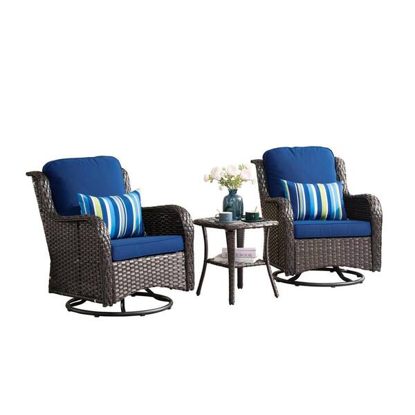 Clario 3-Piece Wicker Outdoor Rocking Chair Patio Swivel Chair Set with Navy Blue Cushion, Side Table for Backyard