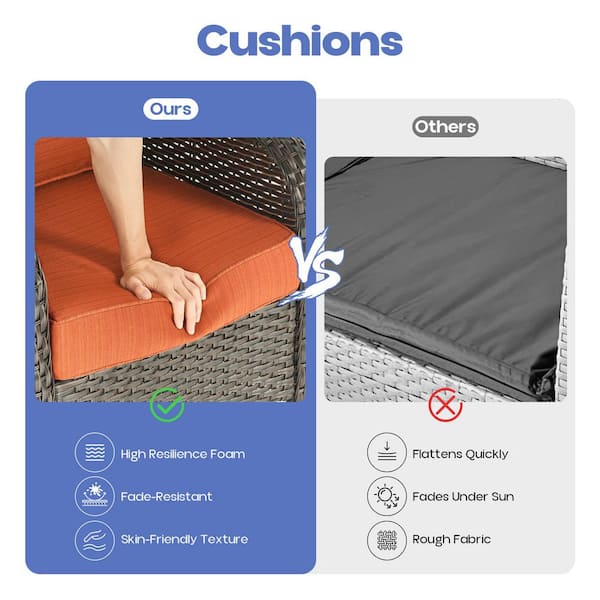 Clario 6-Piece Wicker Outdoor Furniture Patio Conversation Seating Set with Fire Pit, Orange Red Cushions and Ottoman