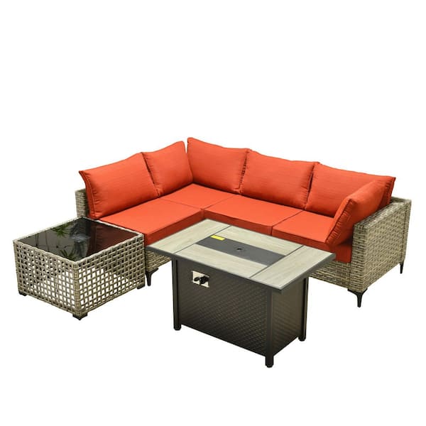 Coralia Gray 6-Piece Wicker Outdoor Sectional Set with Fire Pit, Stripe Orange Red Cushion and Lighted Coffee Table