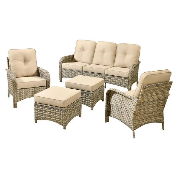 Eliza 5-Piece Outdoor Patio Wicker Conversation Sofa Seating Set with Ottoman and Beige Cushions