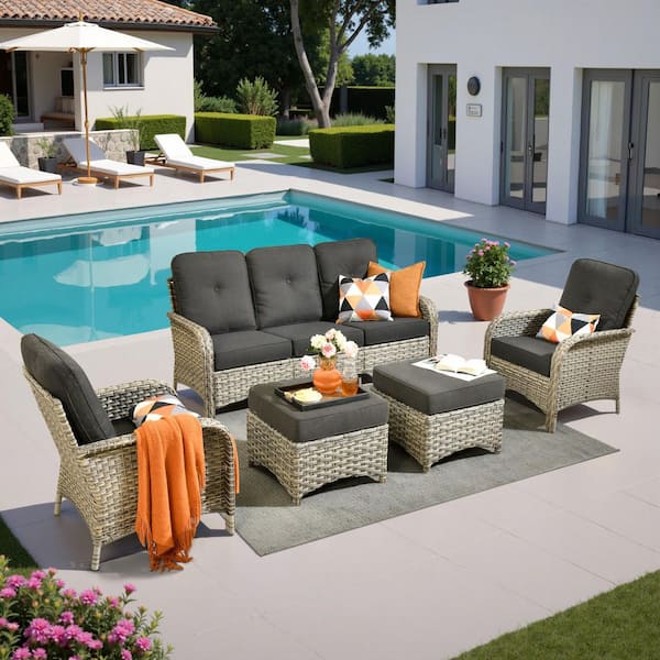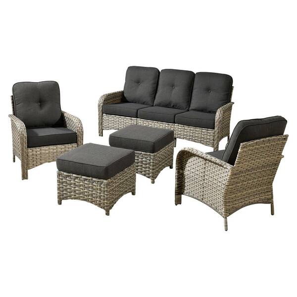 Eliza 5-Piece Outdoor Patio Wicker Conversation Sofa Seating Set with Ottoman and Black Cushions