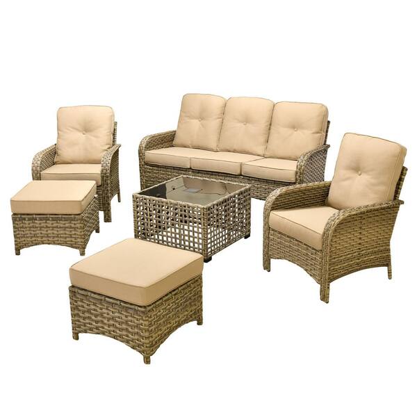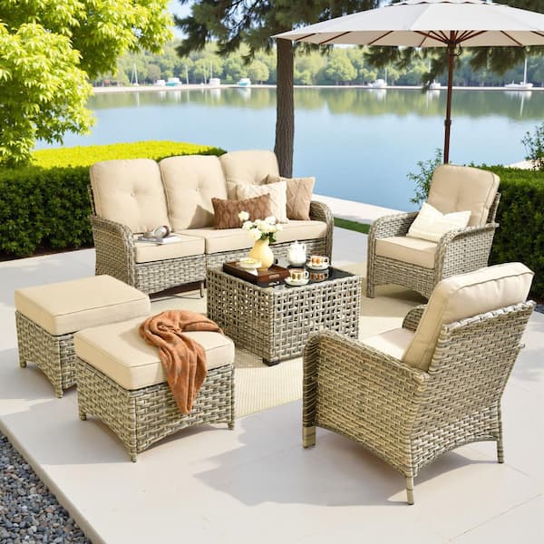 Eliza 6-Piece Outdoor Wicker Conversation Sofa Seating Set for Patio, with Ottoman, Beige Cushions and Coffee Table.
