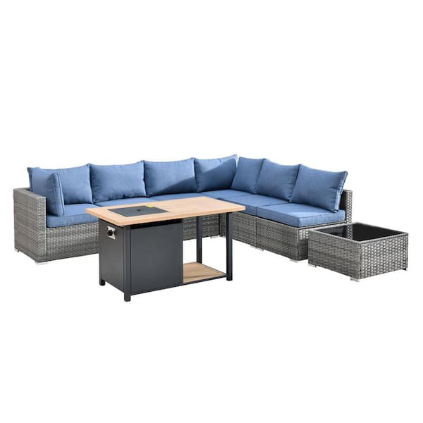 Elora Gray 8‑Piece Wicker Outdoor Sectional Set with Fire Pit Double-Tier, Denim Blue Cushion and Coffee Table