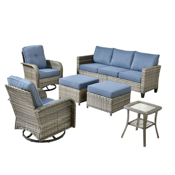 Elysia Gray 6-Piece Wicker Outdoor Sectional Patio Conversation Set with Denim Blue Cushions Rocking Chairs and Ottomans