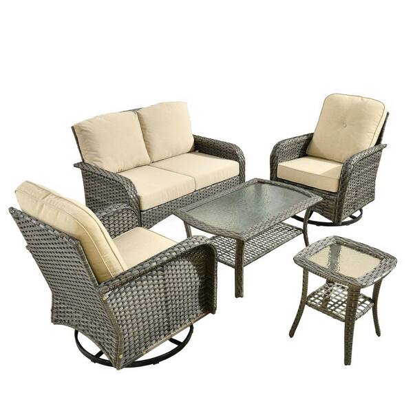 Gray 5-Piece Swivel Wicker Outdoor Lounge Chair Sofa Set with Beige Cushions & 2 Table for Patio, Garden (2-Pack)